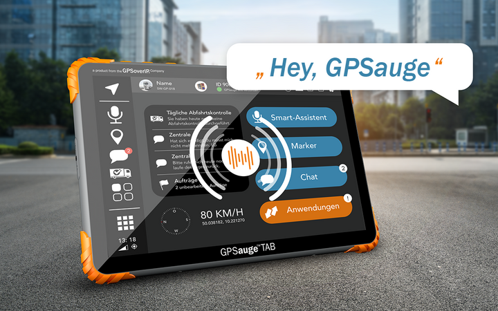 Mit dem neuen Sprachassistenten lässt sich das Fahrerdisplay GPSauge TAB künftig komplett per Sprache bedienen. Ob Navigation, Auftragsstatus oder Rückmeldung an die Zentrale: Ein kurzer Sprachbefehl genügt und das System reagiert.